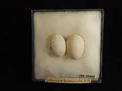 Самка откладывает два яйца размером около 29 х 24 мм[7]. Яйца белого цвета и имеют овальную форму[13]. Инкубационный период продолжается 20—25 дней[9].