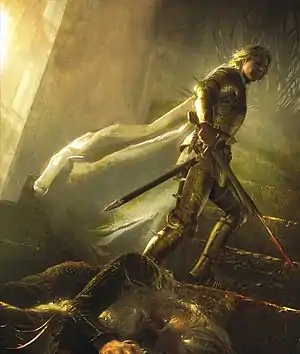 В результате козней Серсеи Роберт получает смертельное ранение в схватке с вепрем. Нед не успевает сообщить ему результаты своего расследования. Король подписывает завещание, в котором назначает Джоффри наследником, а Эддарда — лордом-протектором, после чего умирает[6]. Ренли Баратеон, младший брат короля, предлагает ночью совершить переворот и взять в плен детей Роберта, но Эддард отвергает эту идею. В тронном зале Серсея рвёт завещание и объявляет Джоффри королём, себя — его регентом, а Эддарда Старка — изменником. Стража города — Золотые плащи — вместе с людьми Ланнистеров убивают людей Старка и устраивают резню в башне Десницы. Неда бросают в темницу, а Сансу берут под домашний арест. Арье, младшей дочери Неда, удаётся сбежать из замка и скрыться в городе. Джоффри венчают на королевский трон. Нед в обмен на безопасность Сансы соглашается публично объявить себя изменником, но Джоффри вместо того, чтобы отпустить его, приказывает отрубить ему голову[5]:94. Арья присутствует на казни, после чего вербовщик Ночного Дозора увозит её с собой, обещая вернуть её домой.