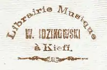 - Шрифтовой штемпель с надписью «Librairie Musique W. Idzikowski Kieff.». Оттиск, полукруглый, 15x26, одноцветный. Конец XIX в.