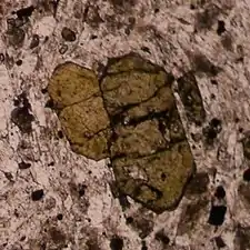 Разрез идиоморфного включения в трахите (аншлиф, поляризационная микроскопия, вид с одним николем)