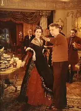 Ещё в самом начале работы нам мерещились такие кадры, как пролившееся от испуганного движения Гани красное вино, растекающееся лужей крови. В сопоставлении со словами князя это должно было рождать предчувствие беды. В нашем представлении многое из происходящего сливалось с отблесками свечей в люстрах, канделябрах и бра, кровавых языков горящего камина и так далее. Все это, как нам казалось, требовало цвета. <…> В цвете мы искали эмоционального дополнения к кадру, а не его раскраски.