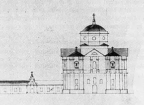 Несохранившийся костёл монастыря представлял собой трехнефовую двухбашенную крестово-купольную базилику с отчетливо выявленным трансептом, имеющую в плане форму латинского креста. Внутри размещалось пять алтарей: Архистратига Михаила, Рождества Богородицы, Распятия Иисуса Христа, св. Иеремии, св. Игнатия. Пресбитерий храма завершался плоской стеной.