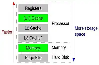 Большинство программистов обычно предполагает, что память делится на два уровня, оперативную память и дисковые накопители, хотя в ассемблерных языках и ассемблерно-совместимых (типа C) существует возможность непосредственной работы с регистрами. Получение преимуществ от иерархии памяти требует совместных действий от программиста, аппаратуры и компиляторов (а также базовая поддержка в операционной системе):
