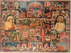В центральной части Иерусалимии обычно помещали изображение главных святынь Иерусалима — Голгофу, Храм Гроба Господня. Их окружали различными сценами на сюжеты Ветхого и Нового Заветов, а также образами палестинских святых. Также на Иерусалимиях изображали чин Благодатного огня, совершаемый в Великую субботу.