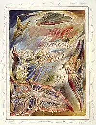 ![]() Лист 2. Титульный лист, копия E. Внизу под заголовком изображение спящей шестикрылой Иерусалим, Эманации Гиганта Альбиона | |