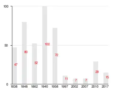 | 1838 | 1848 | 1862 | 1940 | 1958 | 1997 | 2007[18] |