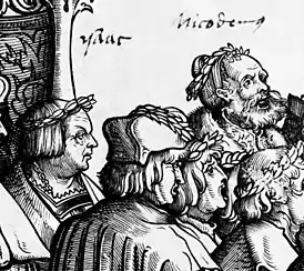 ![]() Хенрик Изак (слева), фрагмент гравюры Ганса Буркмайра | |