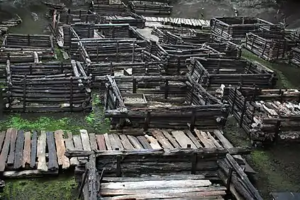 Другая половина избы состояла из двух-трёх этажей. Нижний этаж имел ворота для выгона скота. Дальняя от ворот половина нижнего этажа была разделена на несколько изолированных помещений с маленькими окошками (для коровы с телёнком и овец). В конце узкого коридора были насесты для ночёвки кур.