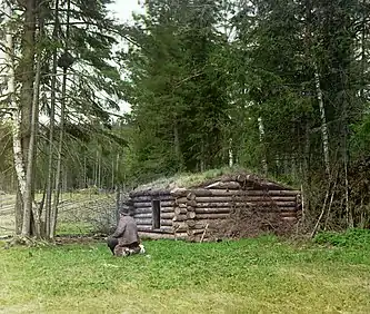 Сруб древнерусского жилища возводился из сосны, реже ели. Совсем редко наряду с ними применялись лиственные породы. Срубы в основном возводили без фундаментов, изредка использовали примитивные валунные, свайные, лежневые фундаменты, иногда низ стен утепляли завалинками. Полы, как правило, были дощатыми, в «полуземлянках» также были земляными[60][61]. Сложно поддаётся реконструкции верхняя часть жилища. Ряд свидетельств позволяет говорить о существовании двухэтажных домов или домов с подклетами, но в массе своей жилища были, конечно, одноэтажными[27]. Окна — волоковые или отсутствовали вовсе. Ради сохранения тепла двери делали небольшого размера, с порогом в несколько брёвен[62]. Скатные крыши, покрытые землёй, упоминал арабский географ начала Х века Ибн Руста[63]: