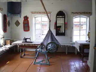 Раскрашенные лавки вдоль стен, зеркало с полотенцем, красный угол, большой и прямой стол, крашеные полы, колыбель на очепе.