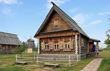 В XVIII—XIX века развитие городской гражданской архитектуры было связано с общеевропейскими стилями барокко, классицизма, ампира[98][99][100]. Под нарастающим влиянием города радикально менялась крестьянская изба. Процесс этот шёл не везде одинаково быстро. В отдалённых поселениях ещё долго (даже в XIX веке[101]) строили по-старому. Например, суровый архаичный облик имела «Изба семи государей» 1765 года в Онежском уезде Архангельской губернии. Эта курная изба была переходным типом к пятистенку, имела однорядную связь с двором и стояла на хозяйственном подклете. На главный фасад выходили окна избы (два волоковых и красное между ними) и волоковое окно хозяйственного помещения. За этими помещениями располагались сени, горницы и далее хозяйственные помещения[102]. Такие избы сменялись эклектичными постройками, которые сочетали элементы древнерусского зодчества и стилевой архитектуры[103]. Детали помещичьих усадеб легко усваивались деревенскими мастерами. Они привносили элементы ордерной системы в облик изб, где они соединялись с богатой народной резьбой[100]. Избы обзавелись большими косящатыми окнами с резными наличниками, мезонинами, окнами для освещения чердака, двустворчатыми дверями, подзорами. Некогда распространённая композиция окон главного фасада как у «Избы семи государей» сменилась тремя большими окнами[104][105]. На рубеже XIX—XX веков в Поволжье и на Севере также распространилась композиция из четырёх окон. Ещё больше окон имели главные фасады северных двухэтажных пяти- и шестистенков[106]. В итоге этих преобразований, как отмечал А. И. Некрасов, былая монументальность и простота сменилась «сложностью и живописностью во впечатлениях целого»[107]. Впрочем, многие избы ещё сохраняли очень традиционные элементы. Например, в Новгородской губернии избы имели прикрой на уровне межэтажного перекрытия — небольшой дощатый навес. Порой его свес делался довольно большим, обзаводясь стойками и фактически превращаясь в галерейку. Подобные галерейки существовали ещё в древнем Новгороде[108].