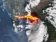 Извержение Кумбре-Вьеха — извержение вулкана Кумбре-Вьеха, расположенного на острове Ла Пальма (Канарские острова, Испания), началось 19 сентября 2021 года в 15:12 по местному времени и закончилось 13 декабря 2021. Оно начиналось как боковое извержение вулканического хребта Кумбре-Вьеха , включающего южную половину испанского острова Ла Пальма на Канарских островах. Это первое извержение вулкана на острове после извержения Тенегии в 1971 году[3]. Оно непрерывно продолжалось 85 дней с очень короткими периодами затишья, когда лава не изливалась из вулкана. Стало самым продолжительным извержением вулкана на Ла Пальме[4][5]. Прошлым рекордсменом по длительности было извержение вулкана Таджуя (84 дня) в 1585 году. Также стало рекордным в истории острова извержением, которое побило все предыдущие рекорды по длительности, по обьему пирокластического материала, по обьему газов, тефре. В результате извержения было уничтожено более 3000 строений[6] и эвакуировано 6000 человек[7][8][9][10][11], планировалось увеличить это число до 10 000[12][13].