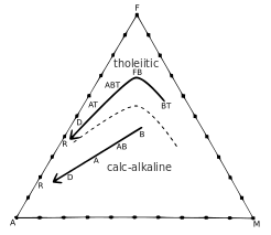 Разница между известково-щелочной и толеитовой сериями может быть показана на диаграмме AFM`, отображающей относительные весовые пропорции компонент: А (Na2O+K2O), F (FeO+Fe2O3) и M (MgO). При остывании, в магматической камере в твёрдую фазу переходит значительно больше железа и магния, чем щелочей. В результате продукты магматической деятельности продвигаются в сторону «щелочного угла» диаграммы (имеют щелочной тренд). В толеитовых магмах при остывании расплав быстро обедняется магнием, из-за образования, обогащённых этим элементом, минералов. Таким образом, продукты толеитовой магмы со временем перемещаются из «магнезиального» угла диаграммы в сторону щелочного. Однако в CA-магме при образовании магнетита железо-магниевое отношение остаётся относительно постоянным, так что фигуративные точки образуют линию близкую к прямой, направленной в сторону «щелочного» угла диаграммы AFM`.