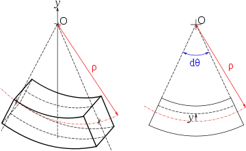 Рассмотрим два смежных сечения, расположенных на расстоянии друг от друга. В деформированном состоянии они развёрнуты на угол друг относительно друга. Так как верхние слои растянуты, а нижние сжаты, то очевидно, что существует нейтральный слой, остающийся нерастянутым. На рисунке он выделен красным. Изменение радиуса кривизны нейтрального слоя записывается следующим образом: