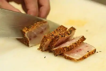 Нарезка продуктов — другой способ измельчения, предполагающий воздействие острым предметом, например, ножом[1], шинковкой, тёркой. В кулинарии известно несколько способов нарезки продуктов: соломкой, кубиками, дольками, кольцами и так далее. Выбор формы нарезки зависит от сырья и желаемой текстуры: перед температурной обработкой овощи можно нарезать ломтиками, чтобы они сохранили форму, а можно раскрошить в пасту[5]. Нарезка может иметь и эстетическую цель, одним из видов такой нарезки является карвинг.