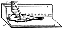 Измерения мелких рыб, а также более точные измерения длины головы и высоты тела производят штангенциркулем. При измерении рыбу кладут на мерную доску правой стороной, головой к торцовому бортику.