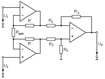 Классическая электрическая схема измерительного усилителя показана на рисунке. Измерительный усилитель представляет собой двухкаскадный усилитель. Для повышения входного сопротивления входной каскад строят на двух отдельных усилителях. Входной каскад представляет собой дифференциальный усилитель, выполненный на двух связанных через резистор неинвертирующих усилителях. Второй каскад — обычный дифференциальный инвертирующий усилитель с высоким подавлением синфазного сигнала[3].