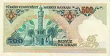 Часовая башня была изображена на оборотной стороне банкноты в 500 турецких лир 1983-1989 годов[3].