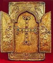 | Складень-реликварий, Вайоцдзорская область, 1300 год | Оклад Евангелия, XV в., Татевский монастырь | Карабахский ковёр «Гоар» с тканной надписью на армянском языке, 1700 г. |
