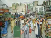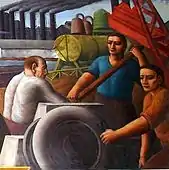 Отсутствие значительных идей в искусстве продвигает бытовые сцены в монументальное искусство (худ. Киндред Маклер, «Почтовые операции», 1937 г., художница Мэрион Гринвуд, стенопись «Разгрузка овощей и фруктов», Виктор Михайлович Арнаутов, «Обработка хлопчатника»).