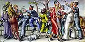 Художники начали фиксировать быт жителей крупных городов и их неуклюжие развлечения. Бытовой жанр лишается идиллических сцен (Уолтер Гай, «Милосердие», 1889) и представляет то проповедь модного миссионера (Джордж Беллоуз, «Проповедь», 1915 ), то скуку в публичном парке (Эверетт Шинн, «Грин парк в Лондоне», 1908 ), то бессмыслицу боксёрских боев (Джордж Беллоуз. «Сражайтесь за пари в Шарки», 1917) или ожесточённую драку пьяниц - посетителей бара (Антон Отто Фишер, 1882-1962, «Драка в баре», 1912)[15][16].