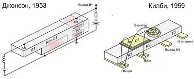 В октябре 1952 года Бернард Оливер подал патентную заявку на способ изготовления составного транзистора (структуры из трёх электрически связанных плоскостных транзисторов) на общем кристалле полупроводника[8][9]. В мае 1953 года Харвик Джонсон подал патентную заявку на способ формирования в кристалле проводника различных электронных компонентов — транзисторов, сопротивлений, сосредоточенных и распределённых емкостей[10]. Джонсон описал три возможных способа производства интегрального однотранзисторного генератора колебаний[10]. Во всех вариантах схема представляла собой узкую планку полупроводника, на одном конце которой формировался сплавной биполярный транзистор[прим. 6]. Тело планки выполняло функцию цепочки электрически связанных сопротивлений[10]. Сосредоточенные ёмкости формировались сплавлением, а распределённые — в виде протяжённых обратно-смещённых p-n-переходов[10]. Неизвестно, сумел ли Джонсон реализовать своё предложение на практике, но спустя шесть лет один из вариантов схемы Джонсона был реализован и запатентован Джеком Килби[8].