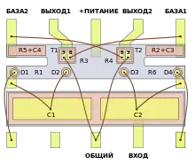 - Все компоненты схемы можно сформировать на одном кристалле полупроводника, добавив лишь соединительные перемычки.