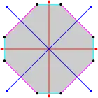 ![]() Изогональный выпуклый восьмиугольник с синими и красными радиальными осями симметрии |