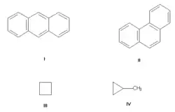 Изомерия углеродного скелета, обусловленная различным порядком связи атомов углерода. Простейший пример — бутан СН3—СН2—СН2—СН3 и изобутан (СН3)3СН. Другие примеры: антрацен и фенантрен (формулы I и II, соответственно), циклобутан и метилциклопропан (III и IV).