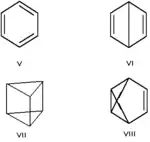 Валентная изомерия — особый вид структурной изомерии, при которой изомеры можно перевести друг в друга лишь за счёт перераспределения связей. Например, валентными изомерами бензола (V) являются бицикло[2.2.0]гекса-2,5-диен (VI, «бензол Дьюара»), призман (VII, «бензол Ладенбурга»), бензвален (VIII).