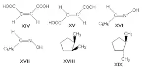 π-диастереомеры, называемые также геометрическими изомерами, отличаются друг от друга различным пространственным расположением заместителей относительно плоскости двойной связи (чаще всего С=С и С=N) или цикла. К ним относятся, например, малеиновая и фумаровая кислоты (формулы XIV и XV соответственно), (Е)- и (Z)-бензальдоксимы (XVI и XVII), цис- и транс-1,2-диметилциклопентаны (XVIII и XIX).