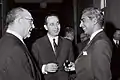 Премьер-министр Гайаны Чедди Джаган беседует с израильским премьер-министром Леви Эшколем (слева) и заместителем министра обороны Шимоном Пересом (в центре) на обеде в честь первого, 4 декабря 1961 года.