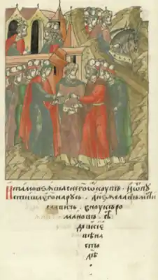 ![]() Выкуп Владимира Рюриковича у половцев (передний план); князь Изяслав садится на Киевском княжении (задний план) | |