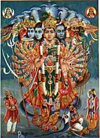 В то время как классическим образом Вишу являете его четырехрукое изображение, в Северной Индии, Непале и Западной Бенгалии распространены уникальные многоликие и многорукие образы Вишну. Их называют «Вишну-Вайкунтха» («Вишну-Чатурмурти») и «Вишну-Вишварупа». «Бхагавадгита» упоминает, что у вселенской формы Вишну множество рук, ртов, глаз и т. д. Как Вишну-Вайкунтха, так и Вишну-Вишварупа являются художественным воплощением идеи вселенской формы Вишну. Первые иконографические решения создавались скульпторами эпохи Гуптов в VI веке — благодаря им родился образ Вишвару́пы (IAST: Viśvarūpa , «обладающий всеми формами», «вселенская форма», «универсальная форма»), всеобъемлющего космического бога, имеющего бесчисленные формы и воплощения[48]. Считается, что образ связан с изображением Вишу-Васудевы и его четырёх эманаций, которые были популярны в древней Матхуре, откуда идея образа мигрировала в Западную Индию, превращаясь в Вишварупу[49].