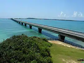 Остров равнинный, наивысшая точка — 28 м. Мостом соединён с островом Миякодзима.