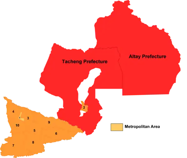 | Округ | Чугучак | 塔城地区 | Tǎchéng dìqū | Тарбағатай аймағы | تارباغاتاي ۋىلايىتى | Tarbaghatay Wilayiti | 994.776 | 104,546 | 16 | |