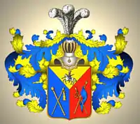 Щит разделён тремя чертами, из них первые две положены с верхних углов к середине, a третья перпендикулярно книзу щита. В верхней части, в золотом поле, изображён воин на лошади, слева направо скачущий с опущенным копьём; в правой части, в голубом поле, крестообразно положены бунчук и булава золотые; в левой части, в красном поле, крестообразно же означены знамя и насек.