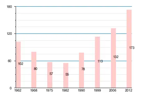 | 1962 | 1968 | 1975 | 1982 | 1990 | 1999 | 2005 | 2006 | 2010 | 2011 | 2012 |