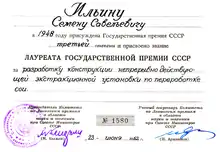 - 1948 — Сталинская премия третьей степени — за разработку конструкции непрерывно действующей экстракционной установки по переработке сои.