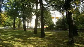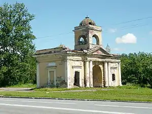 - В восточной части Ильинского сада — между улицей Химиков и рекой Охта стоят Александровские ворота — памятник архитектуры в стиле классицизма, бывшие ворота Охтинского порохового завода в Санкт-Петербурге. Построены по проекту Фёдора Ивановича Демерцова в 1806 году[6].