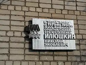 В честь Илюшкина Николая Яковлевича открыты две мемориальные доски[11] ( решение облисполкома 254 от 27.05.1985 г. и решение облисполкома 392 от 12.08.1985 г. - КАУ ВО "Государственный архив Вологодской области[12]"), в домах где он жил: в поселке Тоншалово[13] и в деревне Плосково Череповецкого района, Вологодской области.