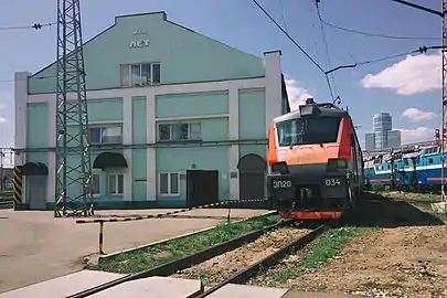 Электровоз ЭП20 на территории депо, сзади видны ЧС7