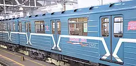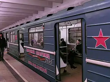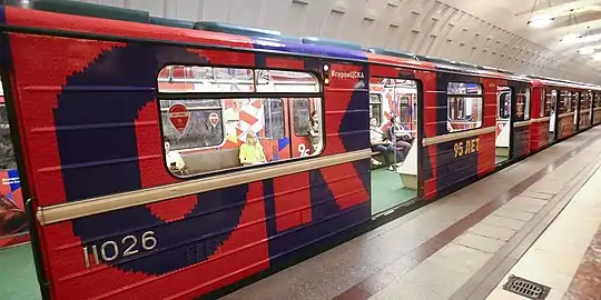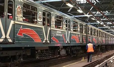 ![]() Поезд в старом оформлении к 70-летию победы в депо «Сокол» | |