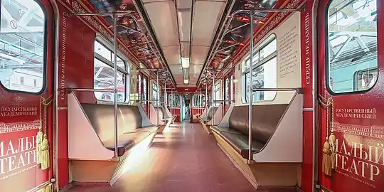 Снаружи поезд отличается от базовой модели следующими деталями: кузов окрашен в цвета, характерные для метро 1930-х годов, использована стилизованная под вагоны типа А лобовая часть головных вагонов с двумя хромированными фарами (но без торцевой двери, в отличие от оригинала). Вместо бортовых номеров вагонов — герб СССР. Внутренняя отделка вагонов выполнена из трудногорючего пластика, имитирующего линкруст — материал, применявшийся в салонах вагонов старых серий; салон оборудован мягкими диванами с боковинами сидений, также смонтированы светильники-бра, характерные для первых поездов метро[12]. Внизу дверей — резиновый уплотнитель в виде «ноги Кагановича». Изначально в вагонах были установлены деревянные рамы окон, впоследствии заменённые на стандартные алюминиевые, оклеенные плёнкой под дерево. Все остальные алюминиевые детали салона (окантовка дверей, рейки между листами пластика) заменены на пластик «под дерево». В остальном состав аналогичен вагонам 81-717.5М/714.5М последних серий и предназначен для регулярной пассажирской эксплуатации.