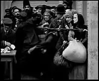 Пароход прибывает в Нью-Йорк. Иммиграционные службы начинают проверку документов у пассажиров. Выход с палубы перекрывают верёвкой, людей грубо отталкивают. Приходит иммиграционный офицер и грубо толкает Бродягу, тот пинает его в зад.
