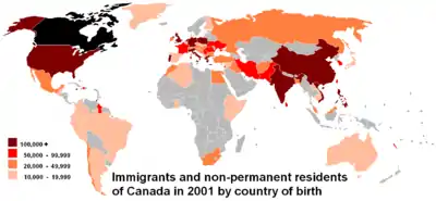 В 2006 году Канада приняла 236 756 иммигрантов. В первую десятку стран-источников вошли Китай (28 896), Индия (28 520), Филиппины (19 718), Пакистан (9808), США (8750), Великобритания (7324), Иран (7195), Южная Корея (5909), Колумбия (5382) и Шри-Ланка (4068)[6]. За этими странами вплотную идут Франция (4026) и Марокко (4025), с Румынией, Россией и Алжиром, каждая из которых дали 3500 иммигрантов[7]. В 2016 году Канада приняла 300 000 иммигрантов.