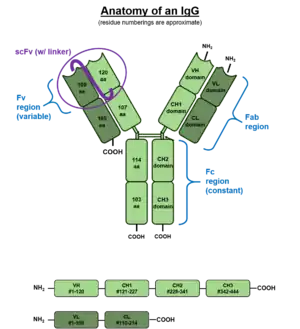 Антитела IgG — крупные молекулы массой около 150 кДа[2][3], состоящие из четырёх полипептидных цепей. Одна молекула IgG содержит две идентичные тяжёлые цепи типа γ массой около 50 кДа и две лёгкие цепи массой около 25 кДа. Две тяжёлые цепи связаны друг с другом и с лёгкими цепями посредством дисульфидных связей. Получающийся тетрамер состоит из двух идентичных половин, которые вместе формируют Y-образную структуру. На каждом конце «вилки» находится по одному сайту связывания с антигеном, которые имеют вариабельную структуру. «Ствол» Y-образной структуры константен, обозначается Fc и содержит высококонсервативные сайты N-гликозилирования. Присоединённые к Fc N-гликаны обогащены фукозой и образуют сложные структуры. Некоторые из этих гликанов также содержат N-ацетилглюкозамин и α-2,6-связанные остатки сиаловой кислоты[4].