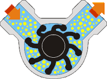 Импеллерные насосы с гибким импеллером представляют собой насосы объемного действия. Корпус насоса выполнен в виде круга, “сплюснутого” с одной стороны. Во время движения лопасти, проходя “усеченную” часть корпуса, попеременно сжимаются[3].