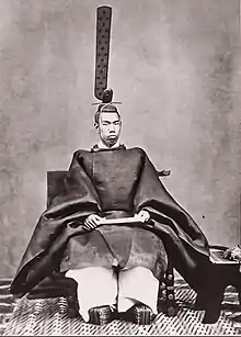 3 февраля 1867 года наследный принц во время состоявшейся в Киото короткой церемонии формально вступил на хризантемовый трон[42]. Новый император продолжил классическое образование, которое не включало в себя основы политики. Тем временем сёгун изо всех сил стремился сохранить свою власть. Он несколько раз просил у императора разрешения на свои действия и в конечном итоге получил его. Сиси и другие мятежники продолжали формировать своё видение новой Японии. Хотя они почитали императора, у них не было намерения использовать его как активную фигуру в политическом процессе[43].