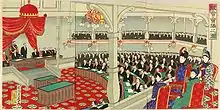Успешные революционеры организовали государственный совет, а впоследствии правительство возглавили три основных министра. Такая структура существовала до введения должности премьер-министра, который в 1885 году возглавил кабинет по западному образцу[60]. Первоначально сохранение императорской власти не являлось основной задачей; лидер революционеров Гото Сёдзиро позднее отмечал, что некоторые чиновники «боялись экстремистов, способных набраться сил и свергнуть Микадо»[61].